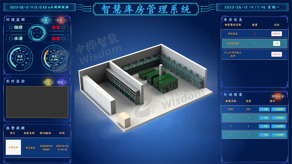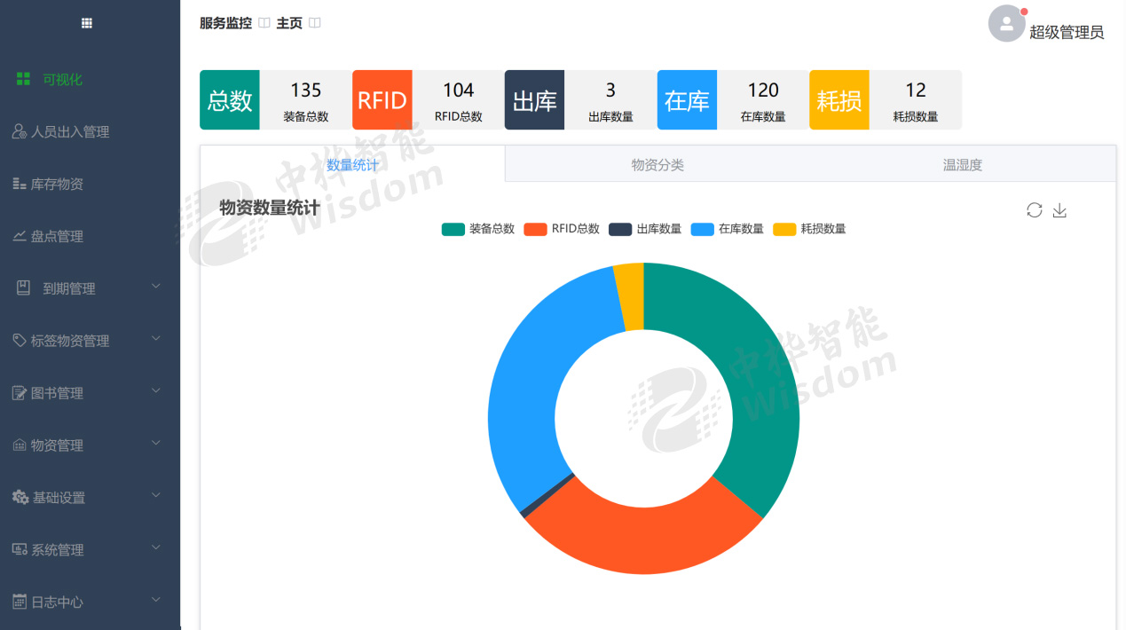 RFID物资管理系统主要包括库房的安防监控、物资的环境监测、出库、入库、移库、盘点、报废和库存预警等操作。设备入库时候加装电子标签,标签内写入物资的信息,每次进行仓库管理操作时,读写器都会读到物资上的电子标签并将信息发送到后台服务器进行处理。